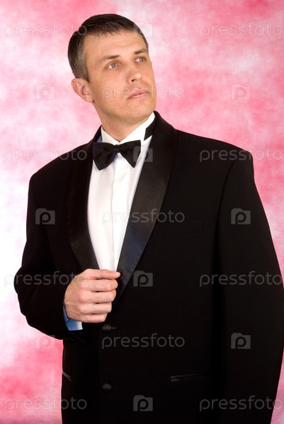 Портрет элегантного мужчины в классическом смокинге на розовом фоне
