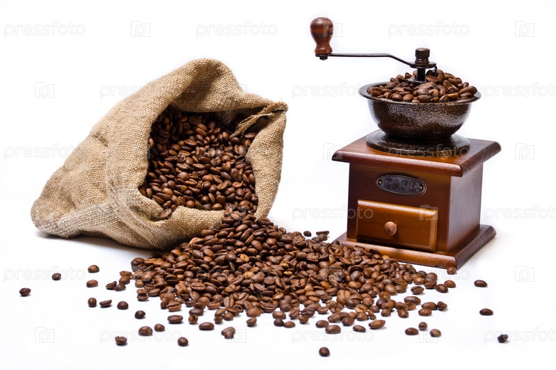 Мешок с жареными кофейными зернами, частично рассыпанными, и деревянная кофемолка на белом фоне