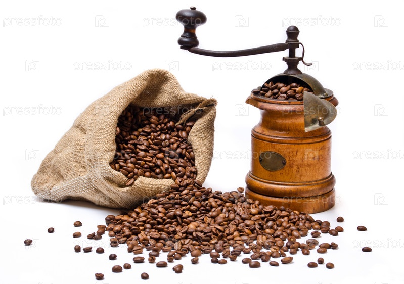 Мешок с жареными кофейными зернами, частично рассыпанными, и старая деревянная кофемолка на белом фоне