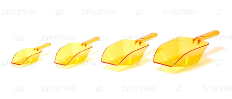 Четыре оранжевых пластиковых прозрачных совка на белом фоне