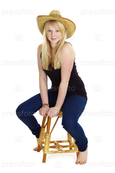 Красивая блондинка сидит на соломенном стуле