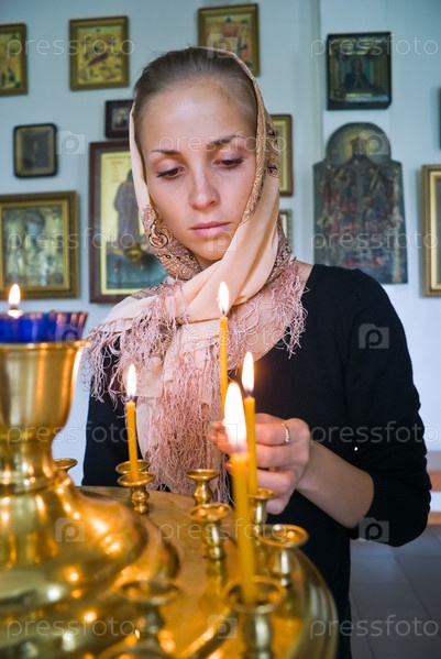 Девушка ставит свечку в православном храме