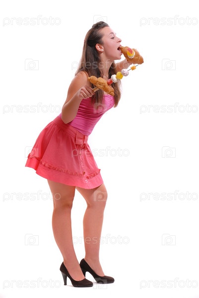 Девушка ест пирожное с шампура