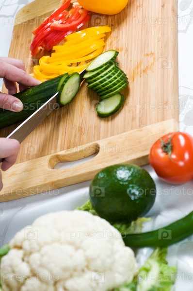 Женщина режет овощи на разделочной доске