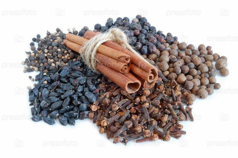 Кучи специй: тростниковые палочки, ягоды можжевельника, барberry, цельный черный перец, белый кориандр и гвоздика на белом фоне