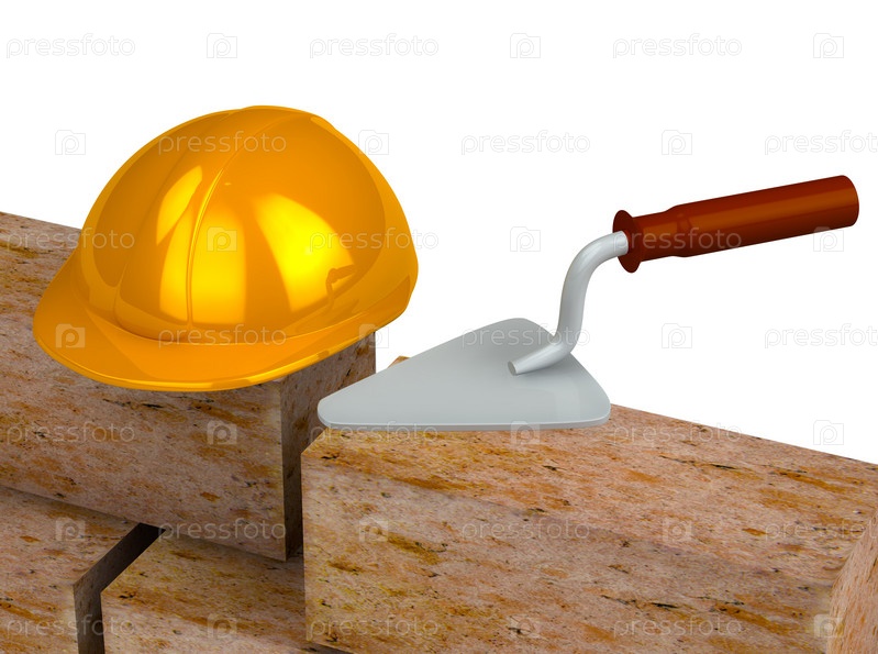 Мастерок, кирпичи и каска, изолированы на белом