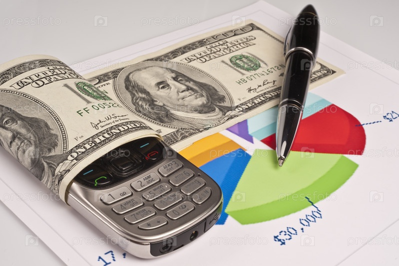 Мобильный телефон, деньги и ручка на листке с изображением диаграммы