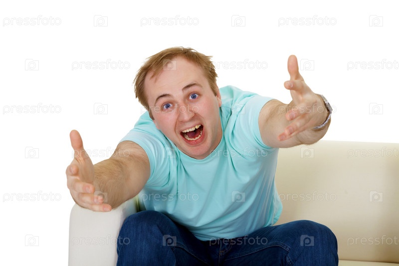 Эмоциональный мужчина на диване тянется, чтобы обнять
