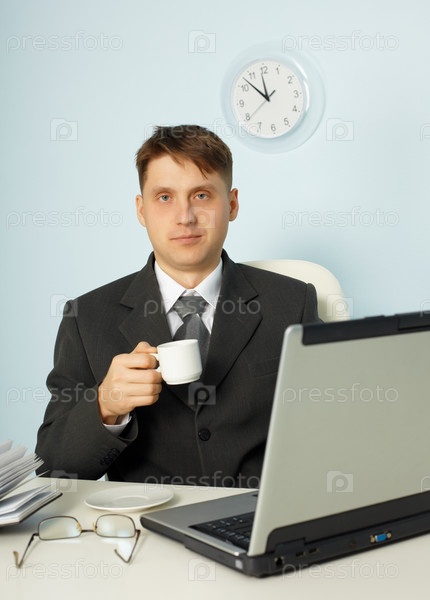 Уставший бизнесмен пьет кофе за рабочим столом