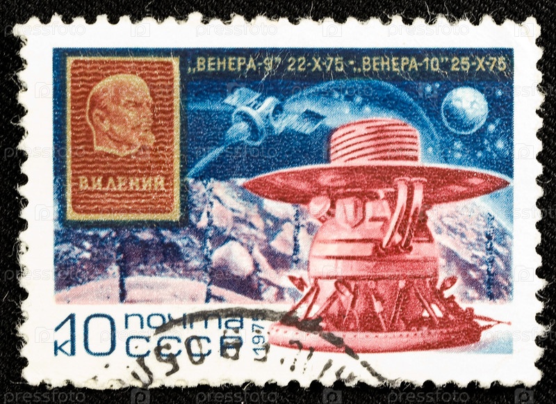 Почтовая марка с изображением спускаемого аппарата на поверхности Венеры (1975 г.)
