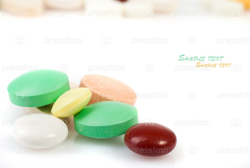 Разноцветные таблетки на белом фоне
