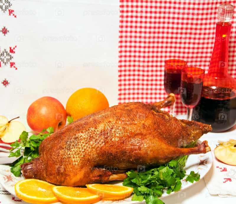 Утка жареной до золотисто-коричневого совершенства с апельсинами и яблоками. ретро стиль