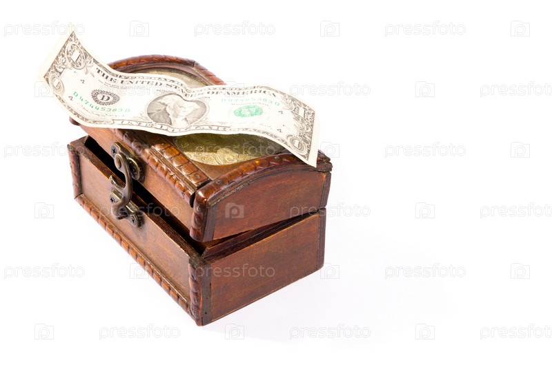 Долларовая купюра лежит на крышке деревянной шкатулки на белом фоне