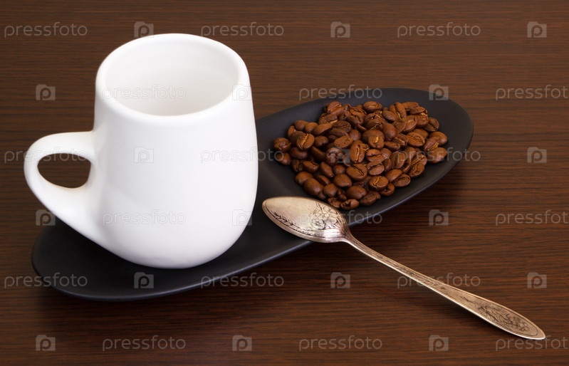 Белая чашка и ложка на блюдце с кофейными зернами крупным планом