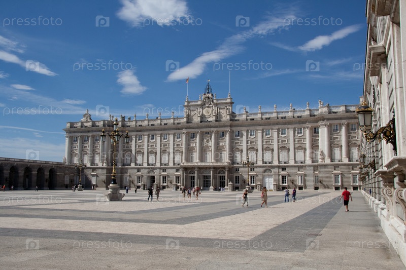 Площадь перед Королевским дворцом (Мадрид) и фасад дворца на фоне ярко-синего неба