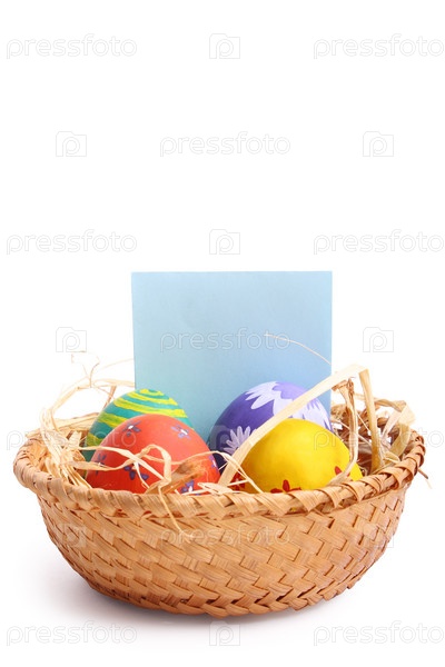 Пасхальные натюрморты: яйца в корзине, украшенные соломой