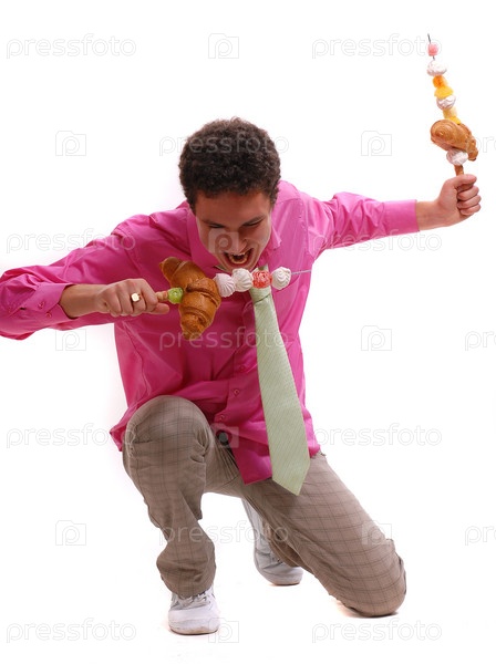 Молодой мужчина, держащий шпажки с едой