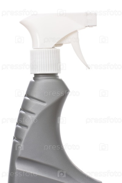 Серая пластиковая бутылка с чистящим веществом, изолированным на белом фоне