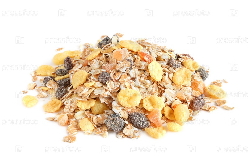 Близкий макросъемка вкусной здоровой мусли с сухими кусочками паупы, ананаса, сливы и изюма