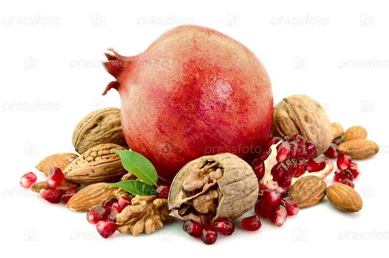 Спелый гранат с орехами на белом фоне