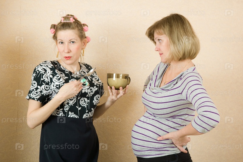 Беременная женщина и ее подруга в бигудях на светлом фоне