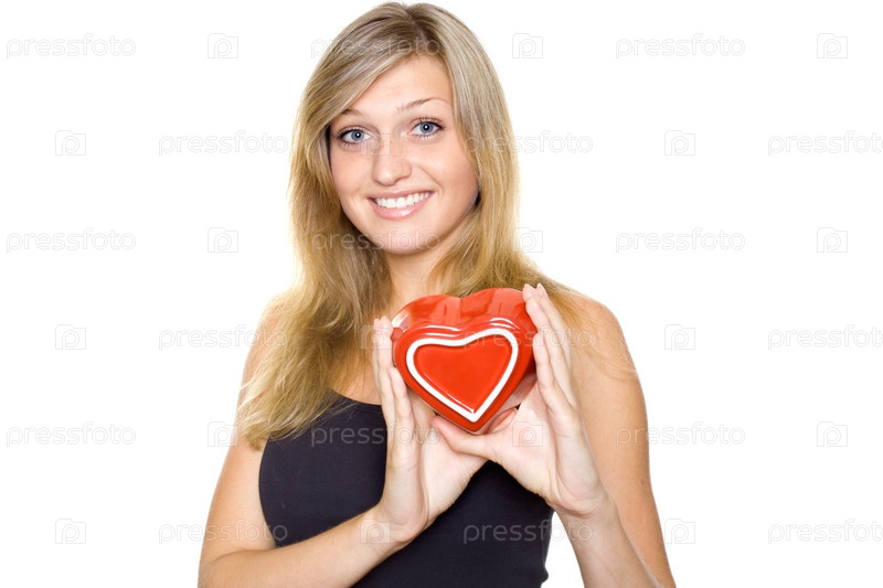 Молодая улыбающаяся девушка с красным сердцем в руках