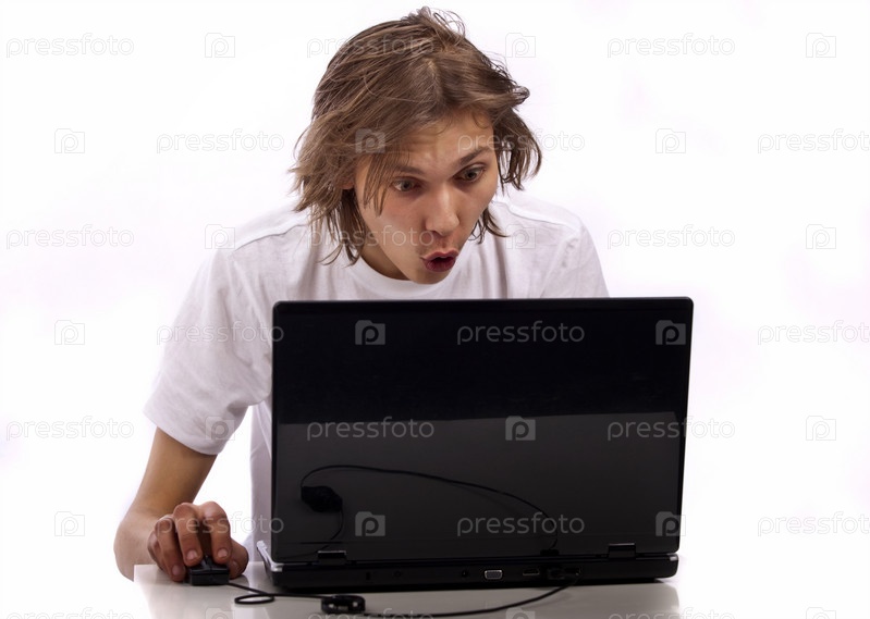 Молодой человек с сумасшедшим видом сидит за ноутбуком