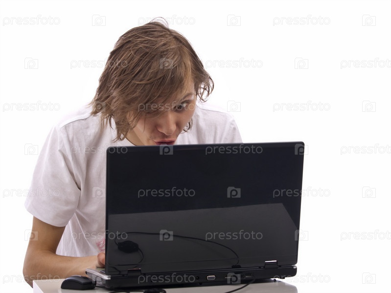 Молодой человек с сумасшедшим видом работает на ноутбуке