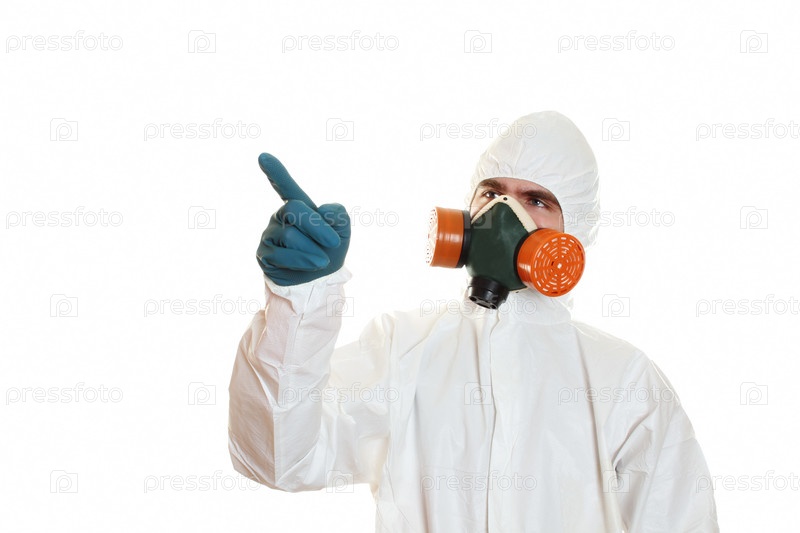 Мужчина в защитном костюме и респираторе