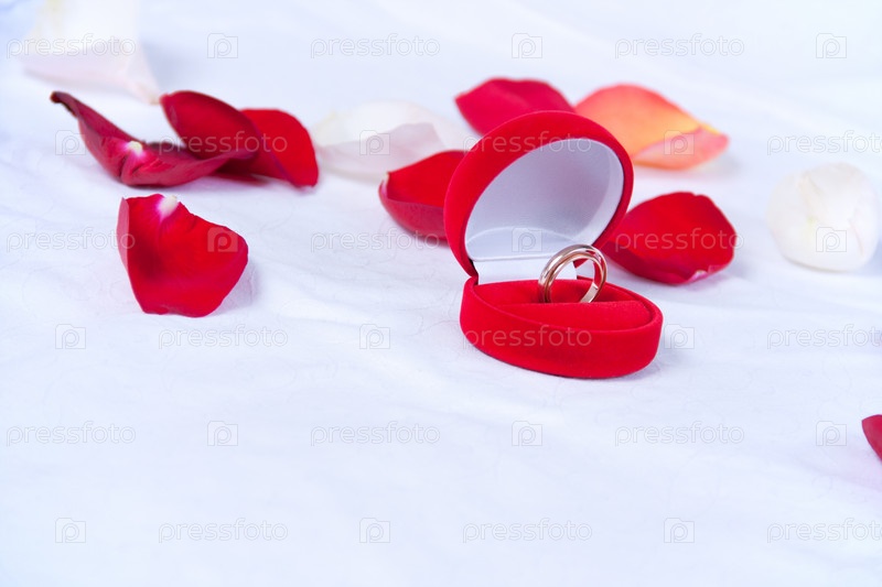 Обручальное кольцо в красной коробочке в лепестках роз