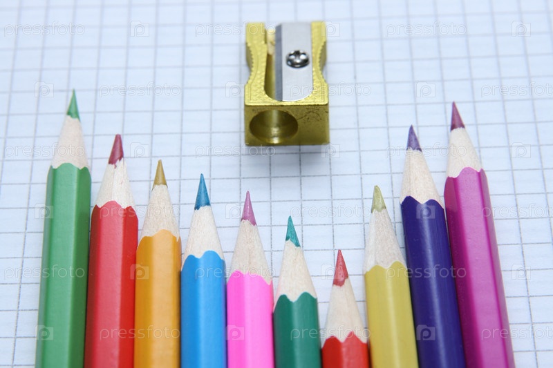 Цветные карандаши и точилка на листе в клеточку