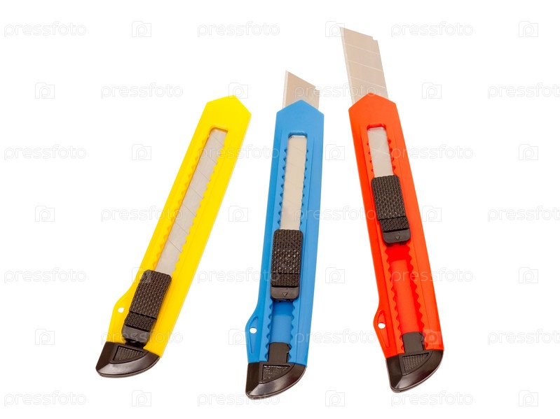 Разноцветные канцелярские ножи на белом фоне