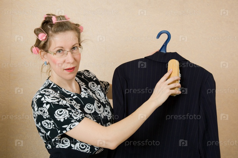 Домохозяйка, чистящая щеткой пиджак