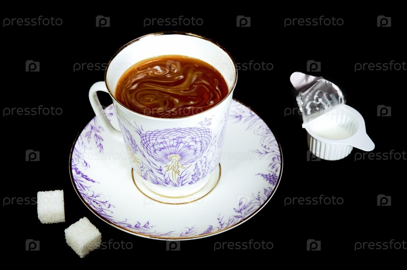 Чашка кофе и кубик сахара, пакет из кремовой фольги на изолированном черном фоне