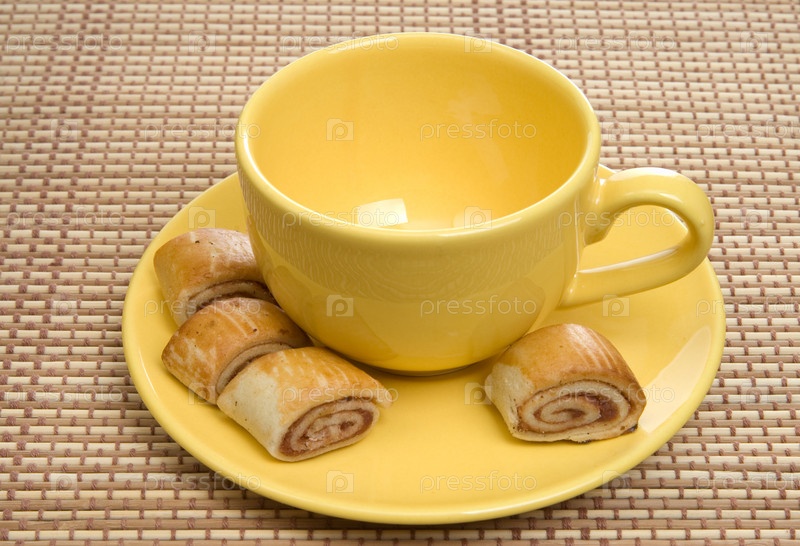 Желтый чайник и печенье с вареной конфетой