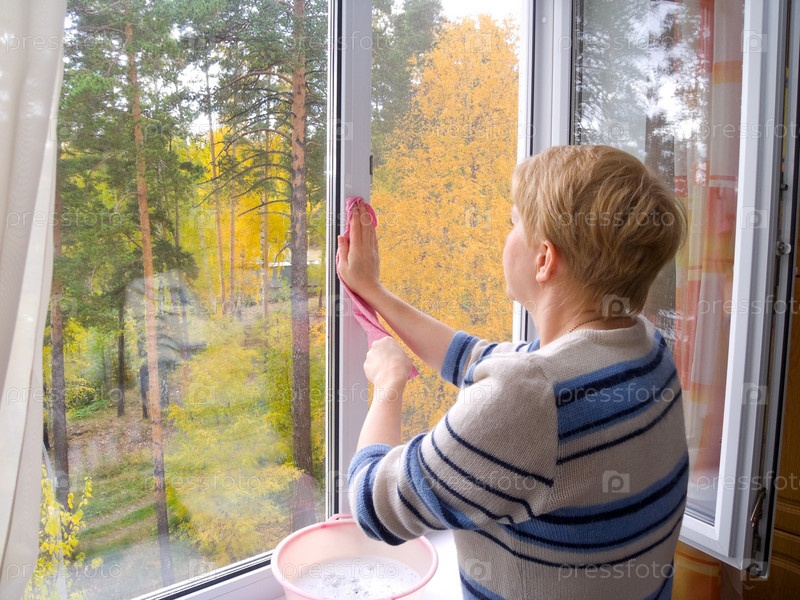 Женщина, моющая окно