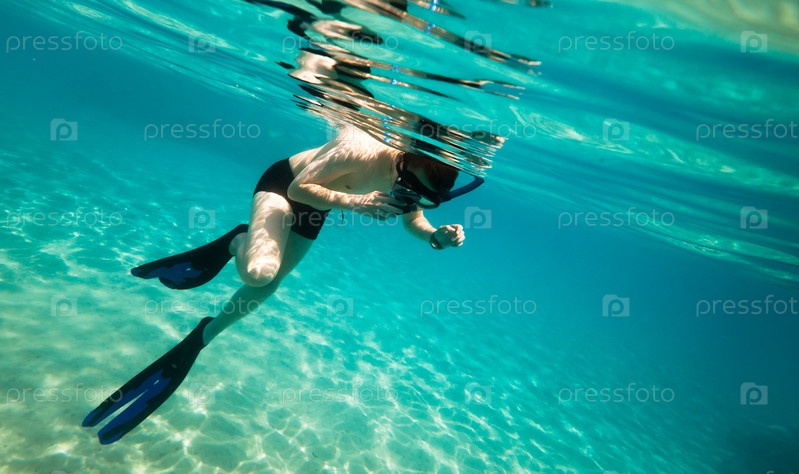 Молодой человек в ластах и маске ныряет на глубину