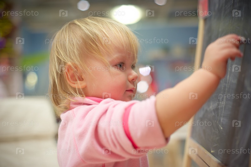 Очаровательный ребенок рисует на доске мелом