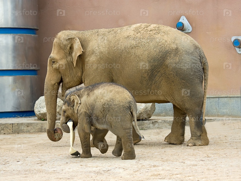 Слониха со слоненком в зоопарке