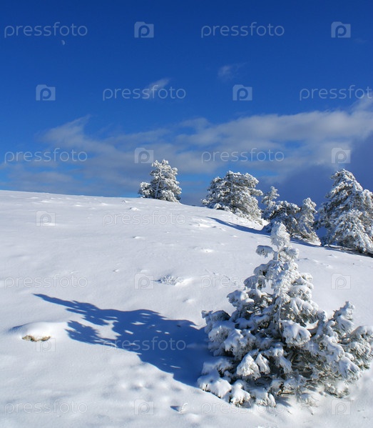 Еловые деревья, покрытые снегом в красивом зимнем пейзаже
