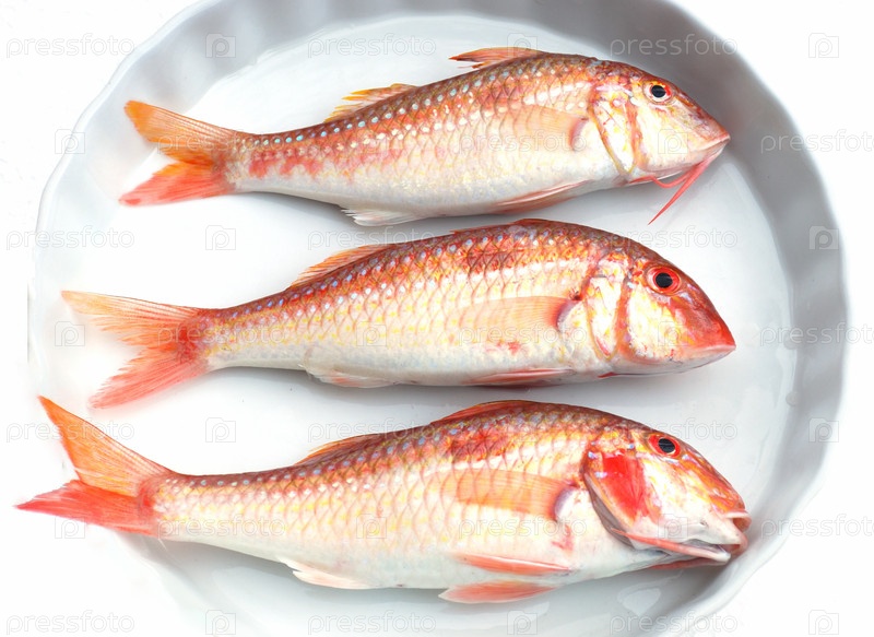 Три свежих красных рыбки на белом блюде