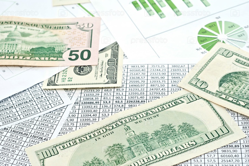 Долларовые купюры на листах с экономическими показателями