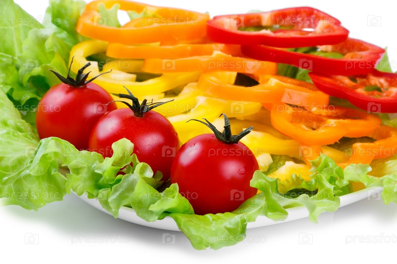 Микс из свежих овощей на листьях зеленого салата, белый фон