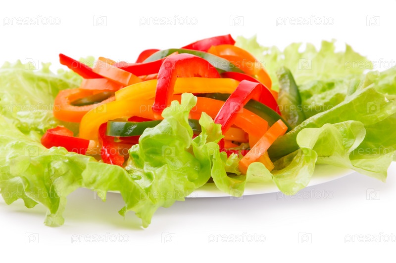 Микс из свежего перца на листьях салата, на белом фоне