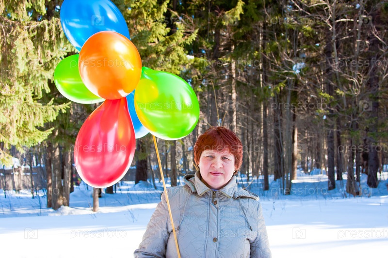 Пожилая женщина с воздушными шарами на прогулке в лесу