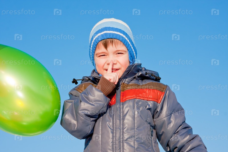 Маленький мальчик с воздушным шариком на фоне голубого неба
