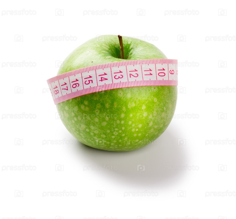 Зеленое яблоко и измерительная лента, изолированы на белом