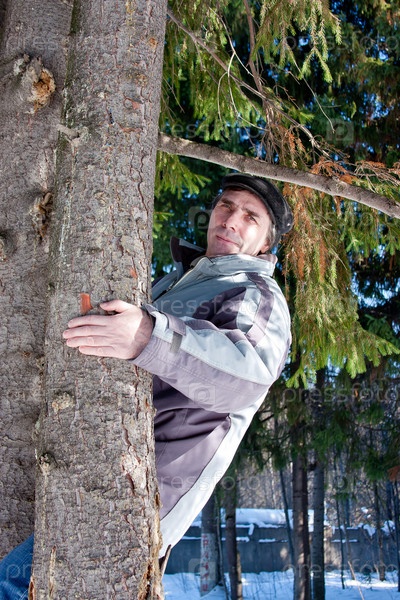 Пожилой мужчина выглядывает из-за дерева на прогулке в лесу
