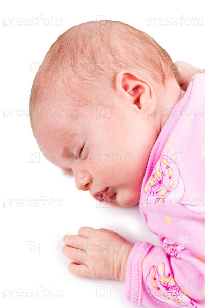 Новорожденная спящая девочка в розовом, изолирована на белом фоне