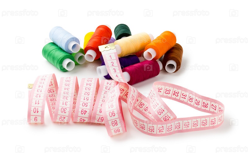Катушки разноцветных ниток и измерительная лента, на белом фоне